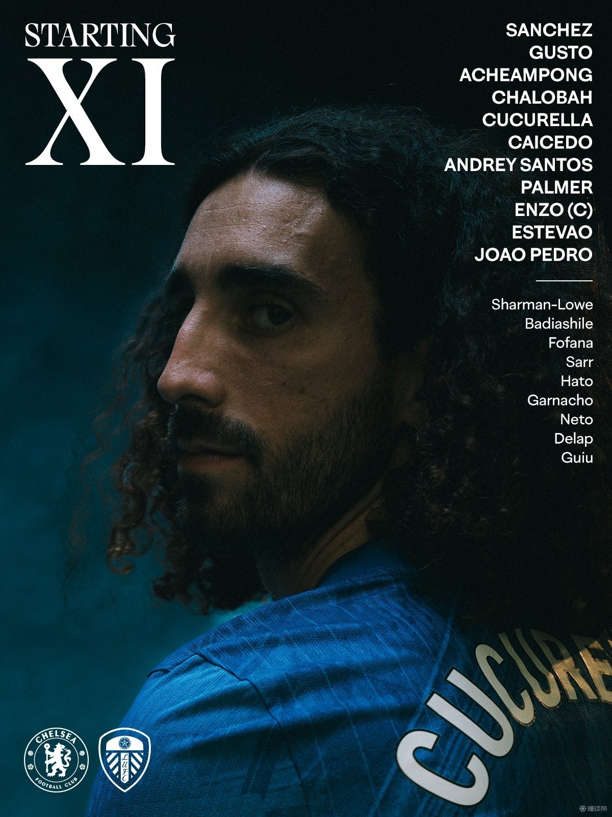 利兹联首发:26-达洛、24-贾斯廷、15-比约尔、6-罗顿、3-古德蒙松、23-博尔顿、44-格鲁耶夫、4-阿姆帕杜、2-博格尔、14-恩梅加、11-阿伦森
