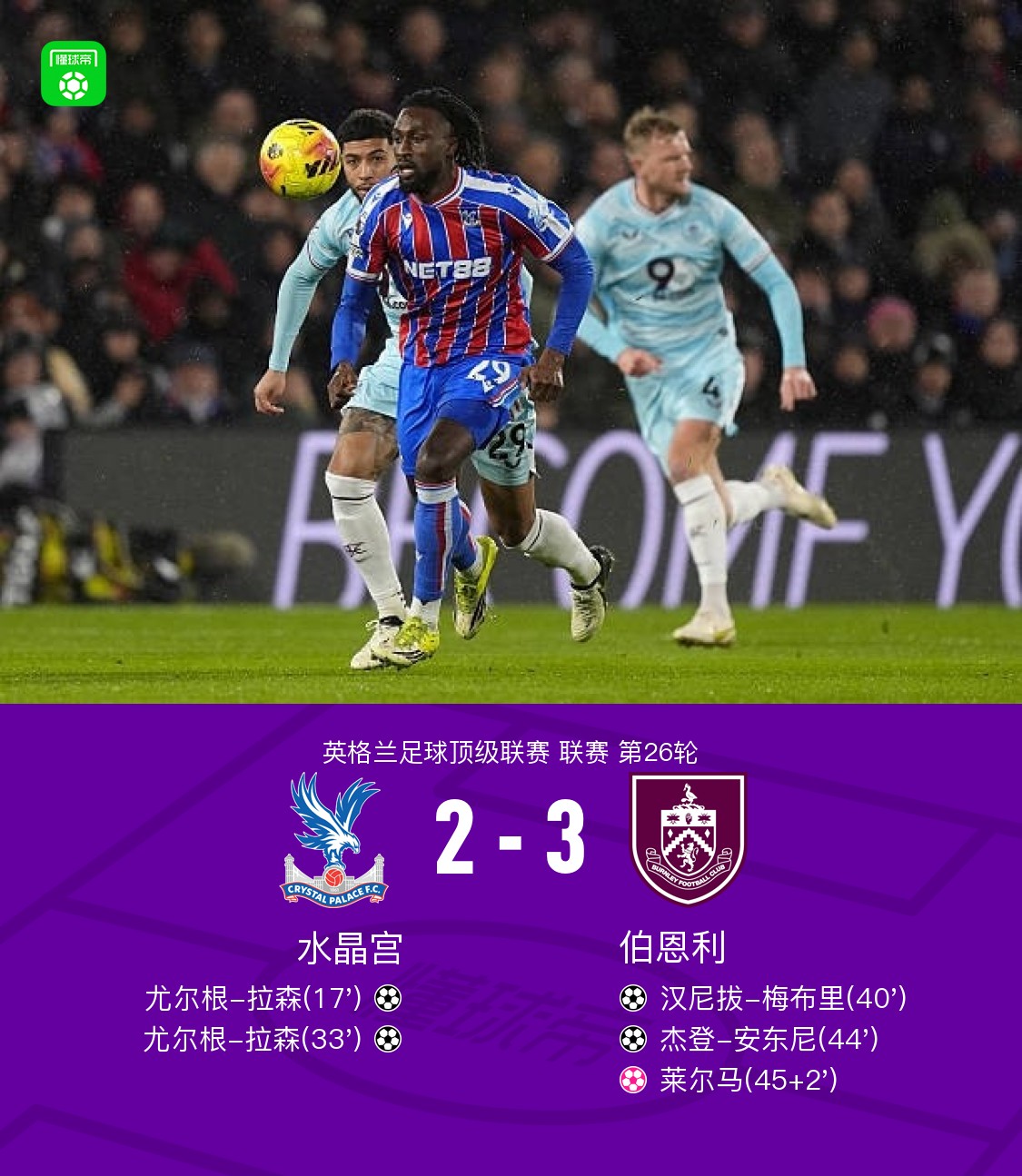 北京时间2月12日英格兰足球顶级联赛 联赛 第26轮,水晶宫主场对阵伯恩利。水晶宫尤尔根-拉森梅开二度,莱尔马自摆乌龙。伯恩利汉尼拔-梅布里破门,杰登-安东尼破门。最终比分水晶宫 2-3 伯恩利。