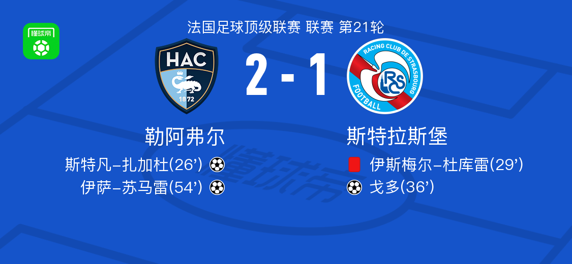 勒阿弗尔2-1斯特拉斯堡,伊萨-苏马雷建功,斯特凡-扎加杜破门