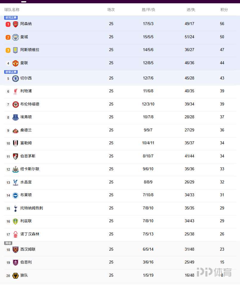 英超积分榜:阿森纳仍6分领跑,利物浦已落后前五4分