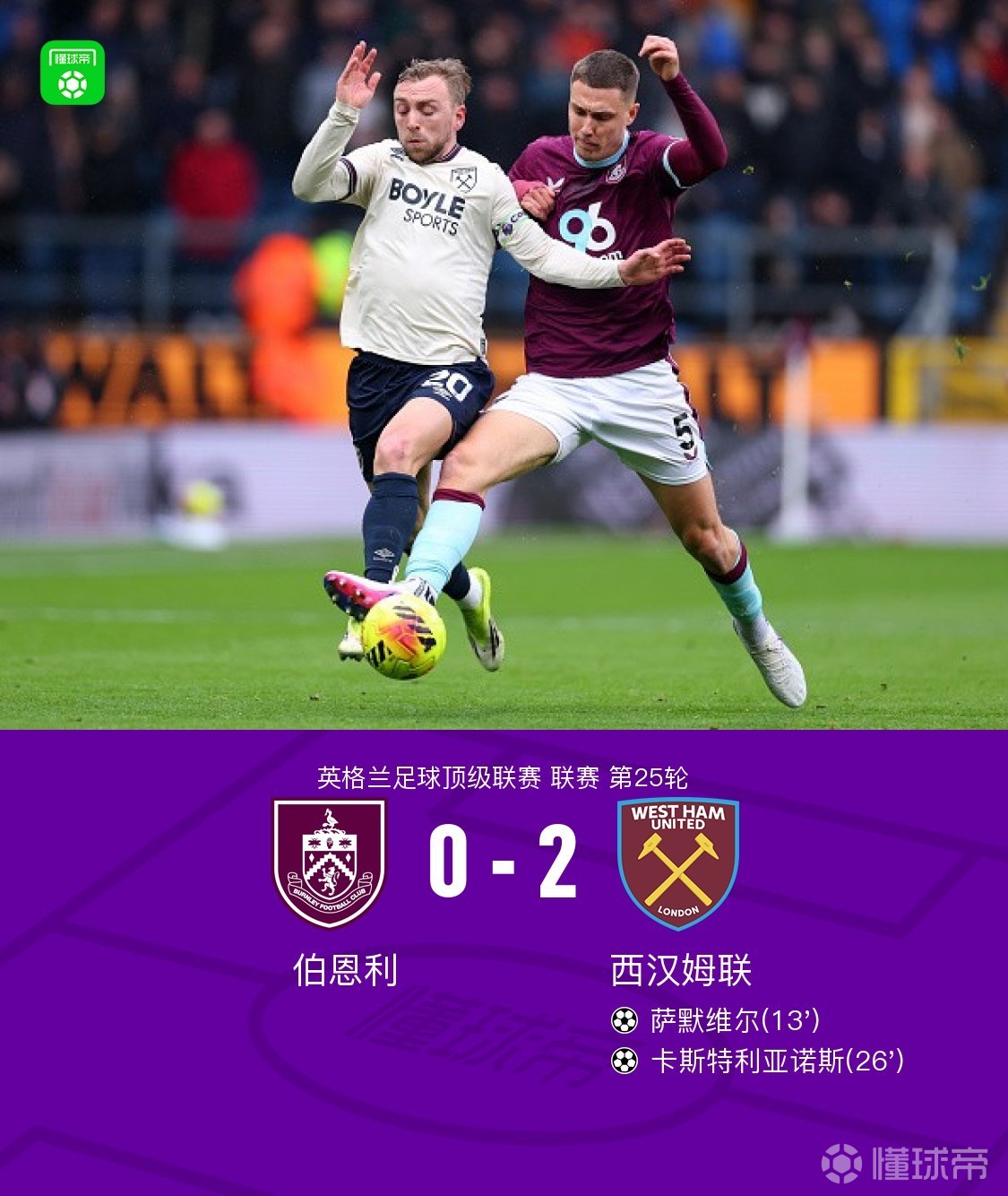 西汉姆联2-0伯恩利,萨默维尔建功,卡斯特利亚诺斯锁定胜局